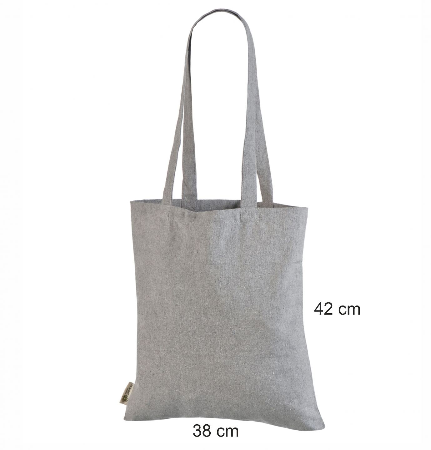 Harmaa kierrätyspuuvillakassi painettuna omalla logolla tai viestillä.