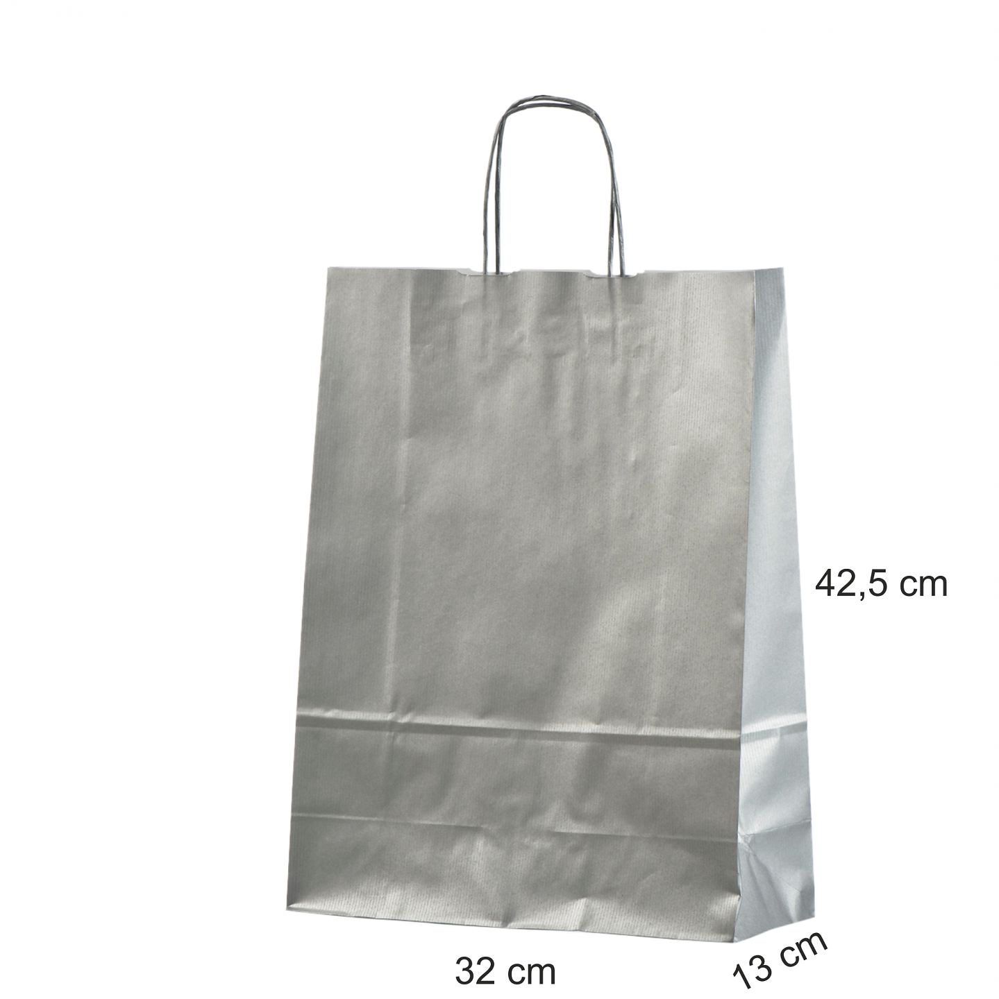 Hopea paperikassi 32x13x42,5 cm Art Arge32   Tästä voitte nähdä hopean paperikassin hinnat seuraaville valmistusmäärille: 50, 100, 200, 300, 500 ja 1 000 kassia, yksipuolisella yksivärisellä painatuksella Hopeiset paperikassit on valmistettu hopeasta voimapaperista. Hopeissa paperikasseissa on hopeat paperinyörikannikkeet.