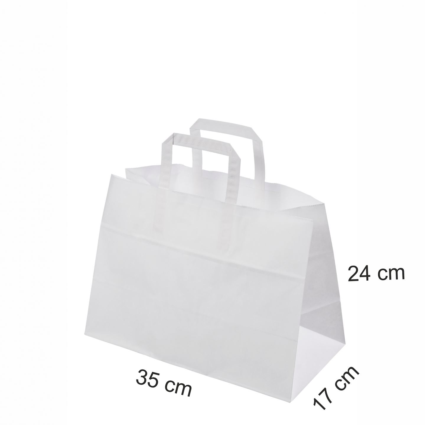 Katso hintaa Valkoiset take away -paperikassit, koko 35x17x24,5   Art 120690   Valkoinen take away -paperikassi valmistetaan 80 gsm/m2 vahvasta kraft-paperista   Tästä voit tarkastella valkoisen take away -kassin hintoja seuraaville valmistusmäärille: 50, 100, 200, 300, 500 ja 1 000 kpl Litteäkannikkeinen take away -paperikassi, valmistettu valkoisesta vahvasta kraft-paperista